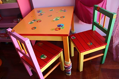 Comprei a mesa e cadeiras em bruto no Ikea, comecei por pintar a mesa e cadeiras de laranja, mas a tinta que comprei só saía com diluente e tinha um cheiro muito forte o que fazia com que tivesse de pintar num local bem arejado. Também não estava a gostar do resultado por isso parei por uns tempos e depois de uns mesitos voltei à pintura mas desta vez com tinta acrílica, dos tubinhos que se vendem nas lojas de artes decorativas (tinta sem cheiro e que saí facilmente com água).